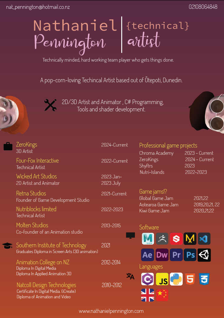 I have been working in the game development industry now for 3 years, I have worked as a Technical artist, a 2D artist and animator, 3D modeler and junior programmer.